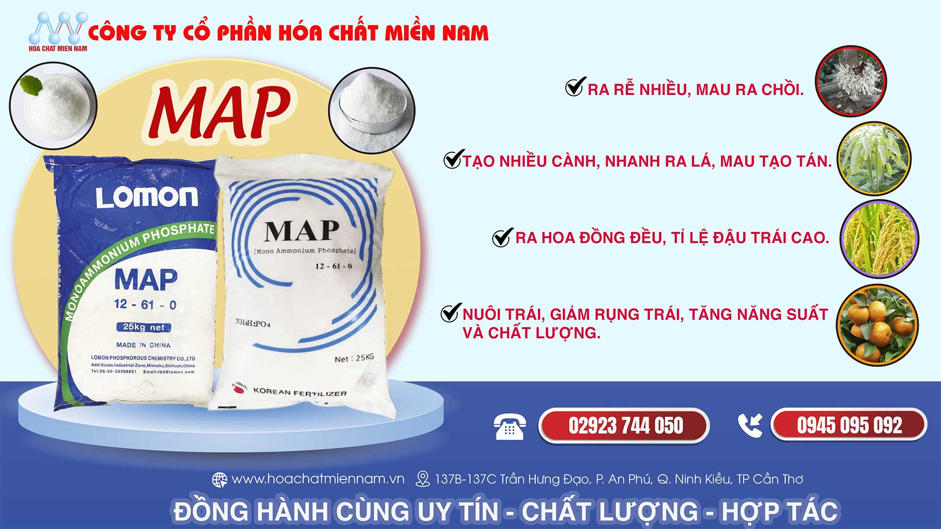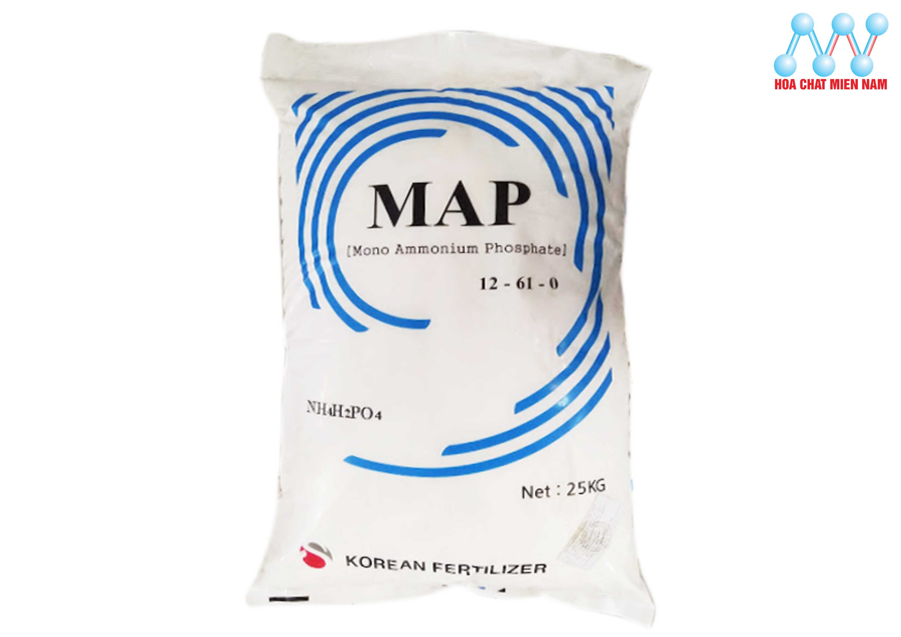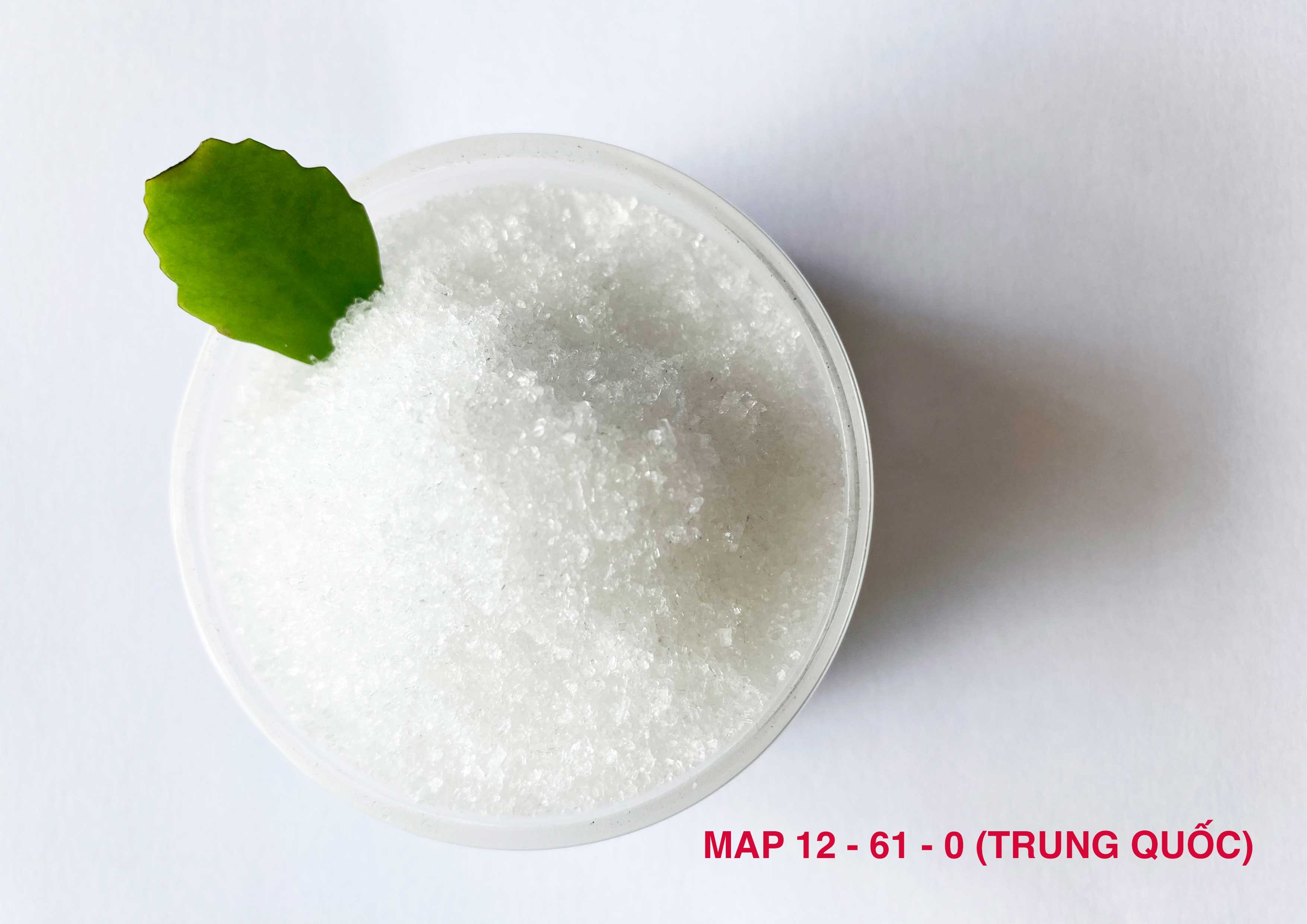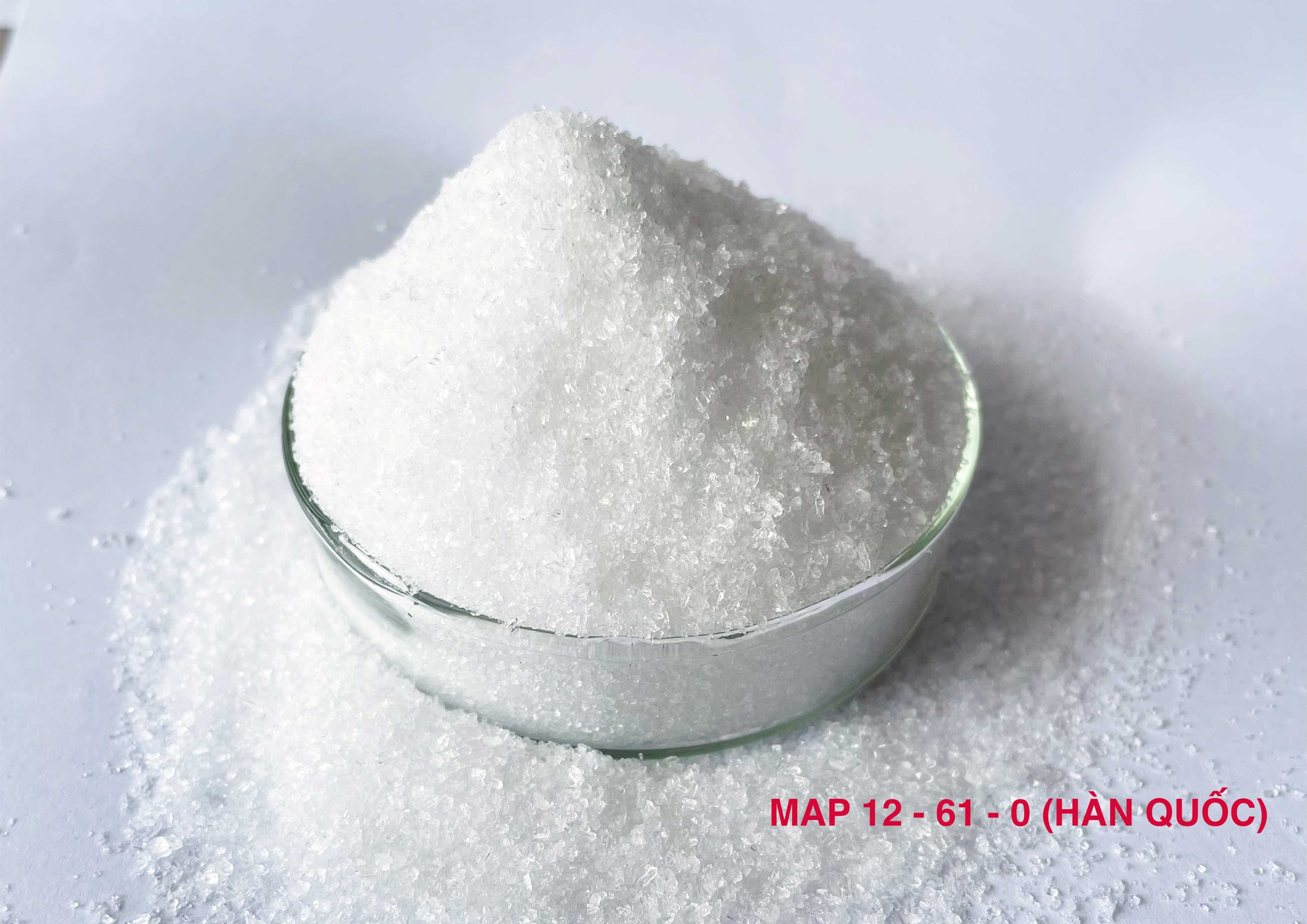 Phân bón MAP 12-61-0 có tên đầy đủ là Mono Ammonium Phosphate có tên gọi khác là Amoni Dihydro Phosphate. Công thức hóa học là: NH4H2PO4. Đây là sản phẩm phân khoáng đa thành phần có hàm lượng dinh dưỡng cao, là chất cải tạo đất phục hồi bộ rễ khi cây trồng bị úng ngập hoặc khô hạn lâu ngày, cây vườn ươm bón lá hoặc phun cho cây ra hoa, phục hồi vườn cây sau khi thu hoạch.